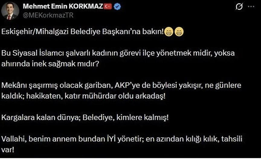 İYİ Parti üyesi Mehmet Emin Korkmaz, sosyal medya hesabından Mihalgazi Belediye Başkanı Zeynep Güneş’in giyim tarzını hedef alan hakaret içerikli bir paylaşım yaptı. Tepki çeken paylaşımın ardından Korkmaz gözaltına alındı ve “halkı kin ve düşmanlığa tahrik” suçlamasıyla tutuklandı.