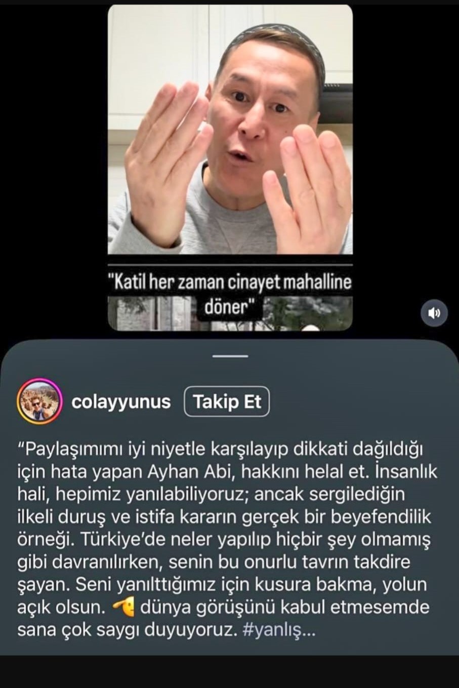 Dün hadsizliği yapan Yunus Çalay, bugün kendi Instagram hesabından çıkıp helallik istemiştir.